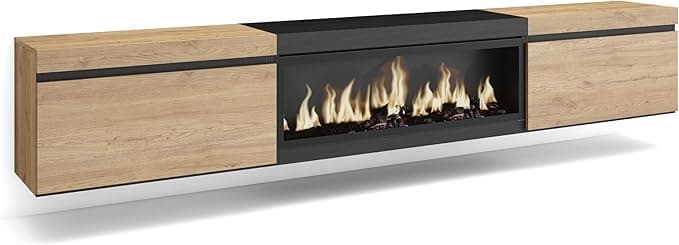 Skraut Home | Mueble TV | Televisión | Muebles de salón, almacenaje | 267x45x35 cm | para TV Gran Formato | Chimenea eléctrica XXL | Colgado, Suspendido | Estilo Moderno | Roble y Negro