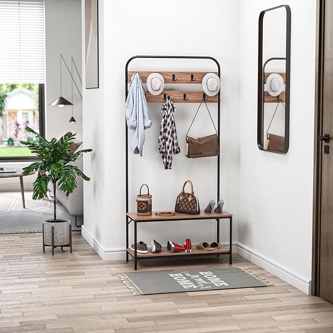 The Davee Hall Tree with Storage Bench in Walnut Color and Black Metal Frame is the perfect solution for your storage needs. This versatile piece of furniture combines a coat rack and shoe rack to add style and organization to any space. It fits perfectly in entryways, halls, foyers, hallways, bedrooms, mudrooms, or offices. The bench can hold up to 200 lbs and the durable iron frame and premium MDF make it stable for long-term use. With easy assembly and cleaning, this hall tree is a must-have for any home.