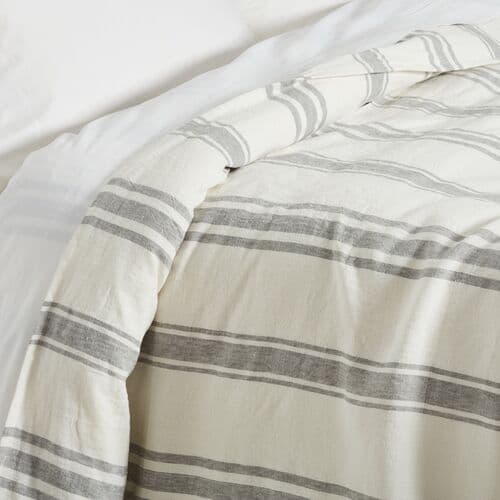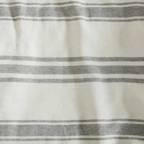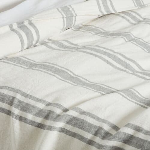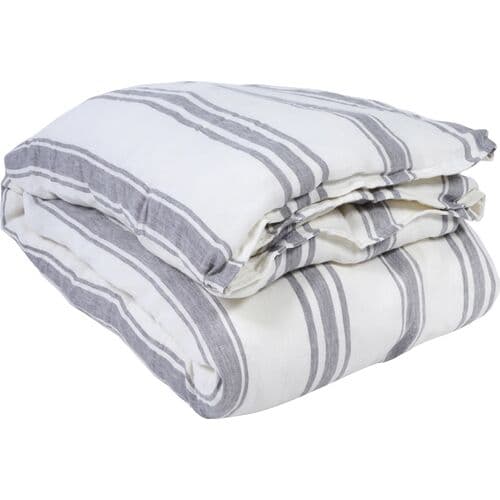 Relaxed linen forms the basis of this duvet cover, featuring gray stripes on a white background and a subtle flange that completes the design. It secures with a button closure.