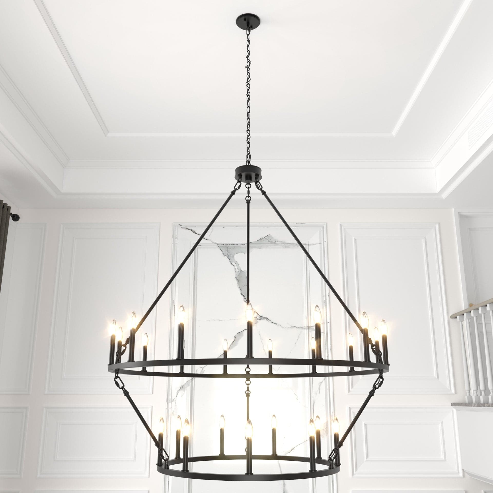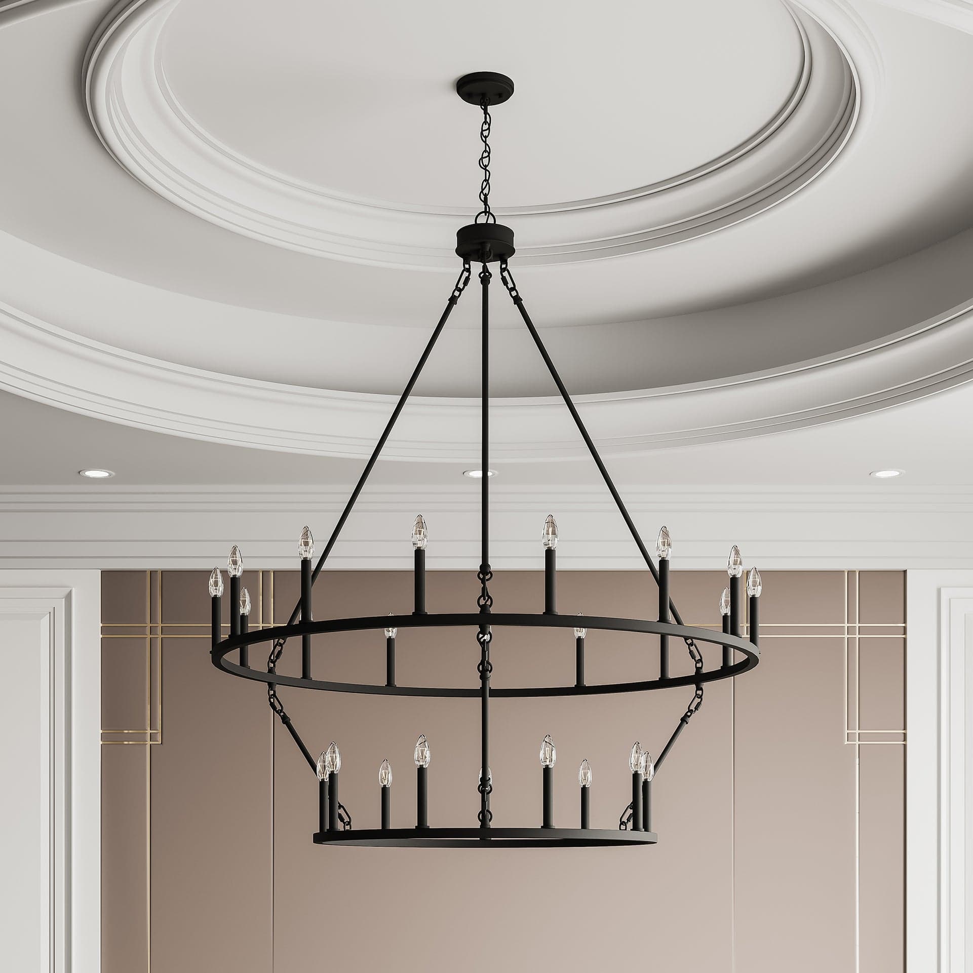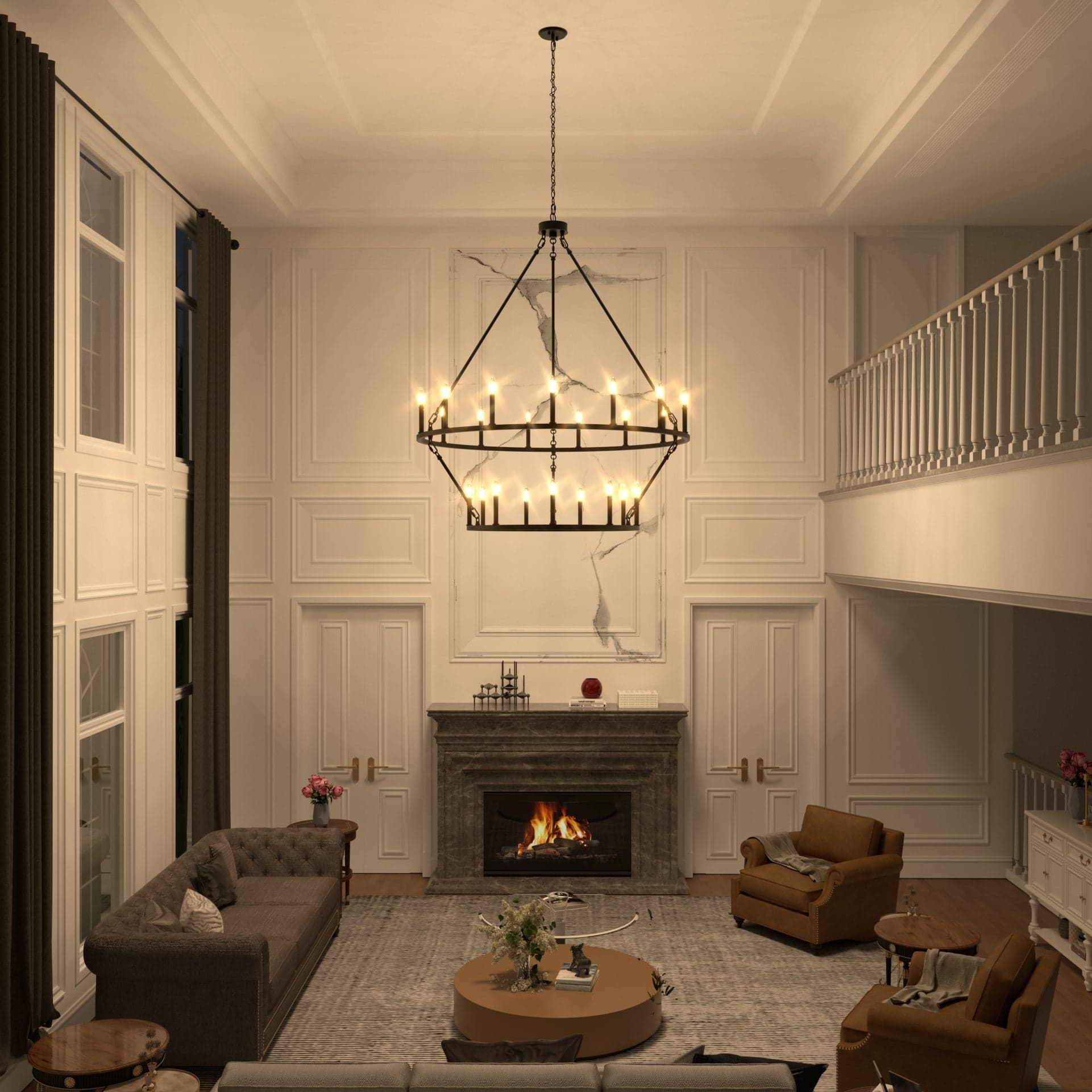 Ce lustre à 24 lumières en forme de roue de chariot de style bougie est simple et généreux. Convient aux meubles de style rétro, de style industriel et de style ferme, durable et facile à assortir. Nous aimons particulièrement ce lustre pour sa polyvalence personnalisable : pour un look moderne, essayez les ampoules à culot bâton et pour un style vintage, choisissez les ampoules à culot bougie. Convient aux grandes scènes, salons, chambres, entrées, tables à manger, etc. Mieux encore, ce lustre est compatible avec les plafonds en pente et les variateurs d'intensité, et dispose même d'une hauteur réglable pour une polyvalence maximale.