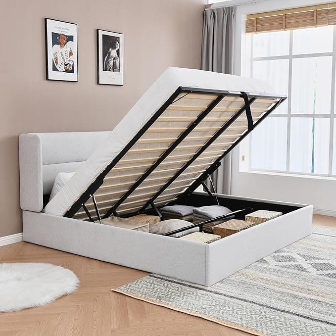 Buy QNZK King Size Bed Frame with Storage, Upholstered Platform with Hydraulic, Linen Fabric Wingback Headboard, Noiseless Wooden Slat Support, No Box Spring Needed, Off White: Bed Frames - Amazon.com ✓ FREE DELIVERY possible on eligible purchases