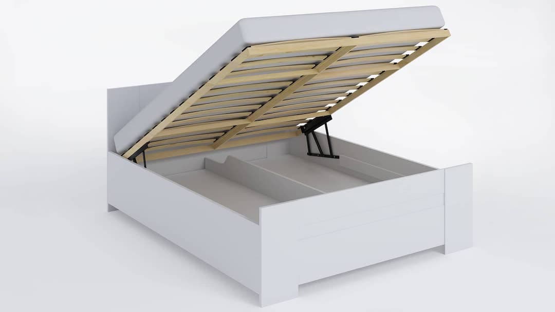The Bono bed is a modern piece which features a liftable slatted base with two large under-bed compartments. It is available in four different colours.
