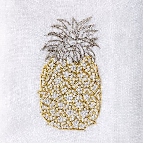 Available exclusively through One Kings Lane, this linen tissue box cover is hand-embroidered with a pineapple motif, showcasing a crisp white finish.