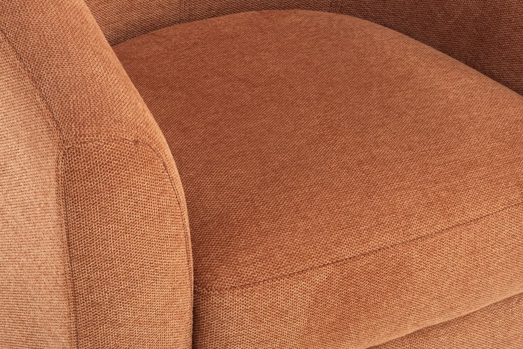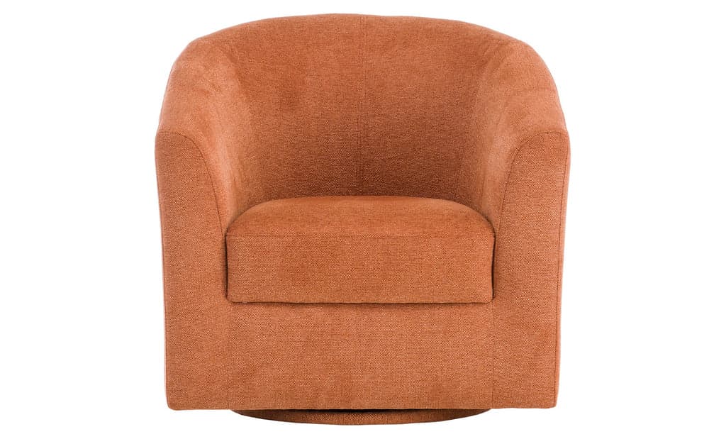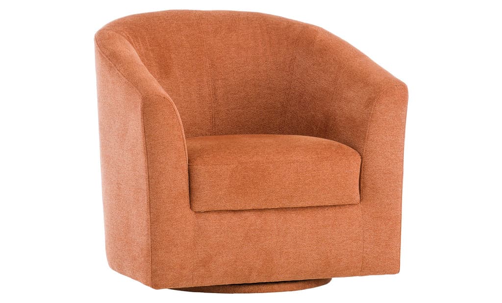 Mod silhouette that feels like a gentle hug as it wraps around you. Sloped arms offer a comfortable place to rest and who doesn't love the swivel feature for smooth swaying while reading or enjoying conversation. 100% Polyester, Cleaning Code: W Fiber Fill Channeled Back Cushions Perelli Webbing Back Support and Sinuous Wire Spring Seat Support. Kiln Dried Solid Hardwood Frame.