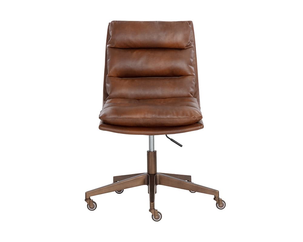 Work in maximum comfort with this mid-century modern office chair that features a generously-padded backrest. Stocked in bravo cognac faux leather. Completed with an antique brass steel base with added castors for mobility. Handle With Care: This design has been crafted with faux leather. Faux leather is manufactured to reflect the natural characteristics of leather; as such, colour variations, markings wrinkles, grooves, and light scratches are appreciated characteristics. No two pieces will be alike. Visit our Product Care page for more information on how to ensure the lasting beauty of this piece.