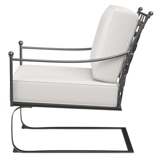 Featuring a robust wrought iron frame and UV-and-moisture-resistant Sunbrella upholstery, the armchair is designed for outdoor durability. A gridded seat back, spring-style frame, and generous padding complement the distressed black finish.