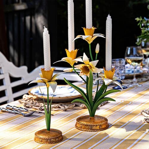 Spring is permanently sprung with this delightful Daffodil Centerpiece Candelabra that brings sophistication and joy to any tablescape. Made of intricately hand-painted metal, upon a bright gold base that’s trimmed with our iconic Berry & Thread motif. The petals and leaves can be gently adjusted into any postures you like best.