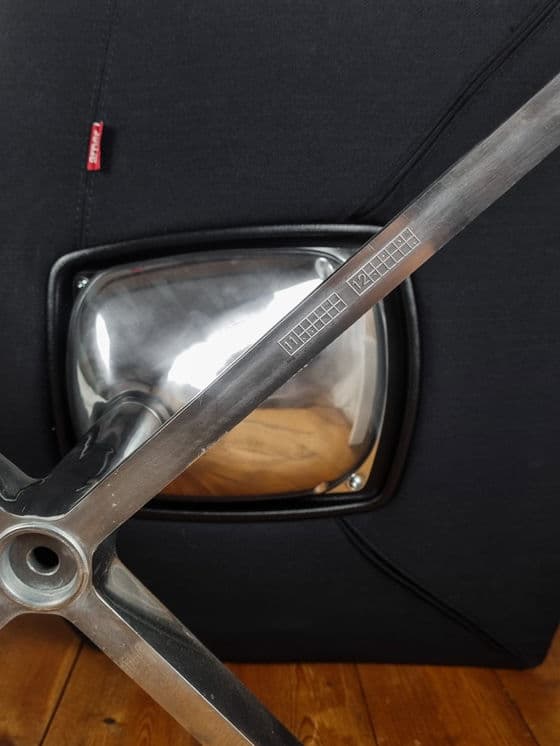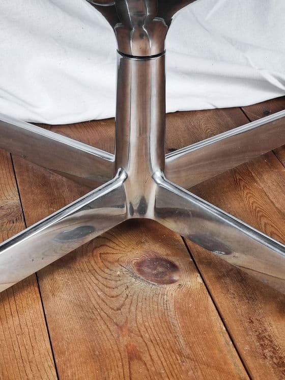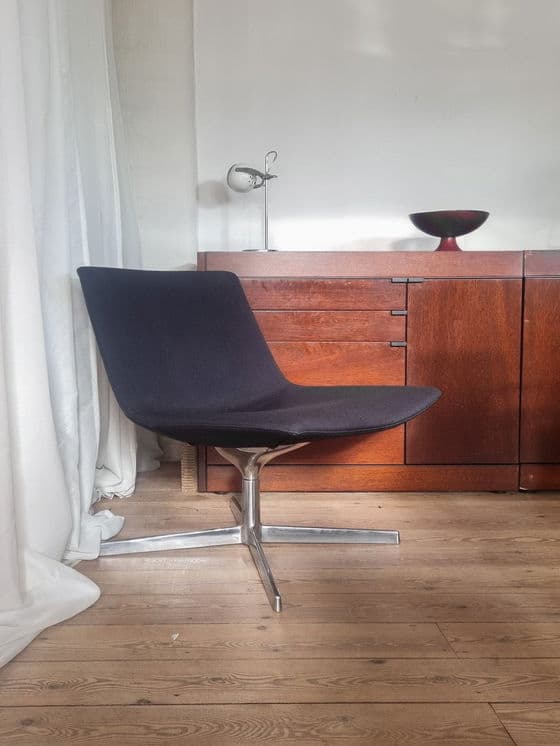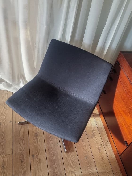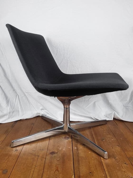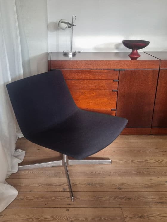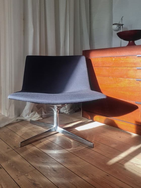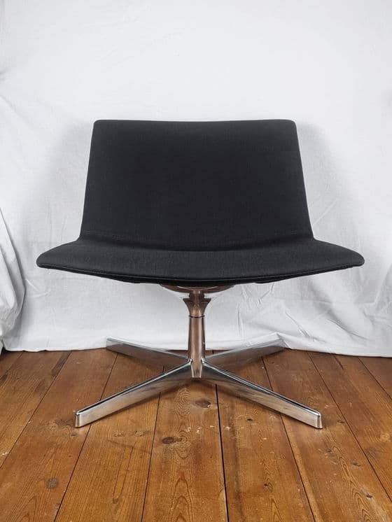 Sessel Arper Catifa 80 4 Wege Loungesessel. Mid-Century-Modern Schöne Sitzfläche mit dunkelgrauer Polsterung. In sehr gutem Zustand nur einige kleine Kratzer an der Basis des Sitzes. Polsterung in gutem Zustand. Der Arper Calita Sitz hat eine Schale aus Polyurethan und das Gestell ist aus poliertem Aluminium gefertigt. Er ist mit dunkelgrauem Stoff gepolstert und verfügt über einen Fuß mit Rückschwenkfunktion. Seine breite Basis sorgt für einen wunderbaren Sitzkomfort. Design des Spaniers Lievore Altherr für das Designstudio Molina und die Marke Arper. Sitzhöhe 37,5cm Tiefe 68cm Breite 64cm Höhe 67cm. Einige kleinere Gebrauchsspuren auf dem Sockel, die für sein Alter typisch sind.