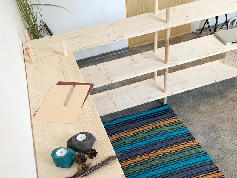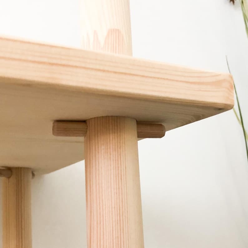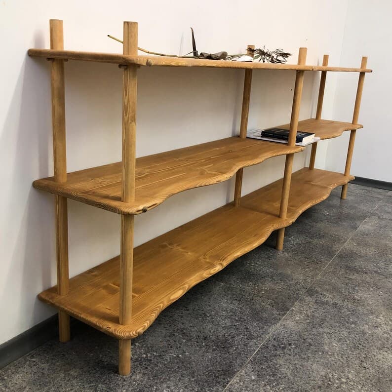 This handmade Montessori furniture features a mid-century modern bookcase that functions as wood storage shelves, a media display, and a vinyl record holder. Ideal for nursery shelves or any room, it combines style and practicality in one versatile piece. Available in 3 sizes and 6 stain colours.