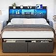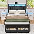 Furnulem Full Size Bed Frame with Wood Headboard, Metal Platform Bed Frame Full Size with Storage Drawers and Shelf, LED Lights and Charging Station, No Box Spring Needed, Noise Free, Black