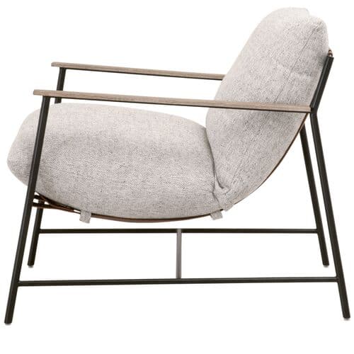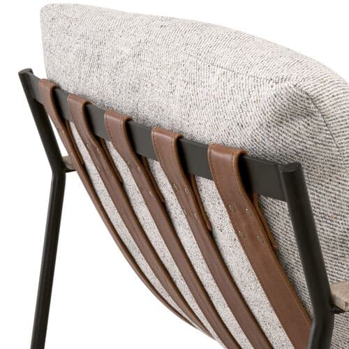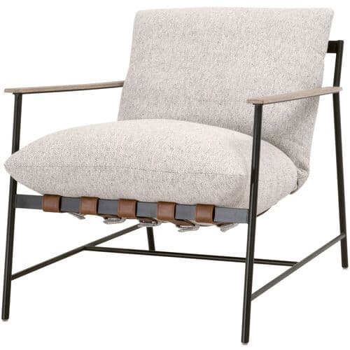 Featuring a minimalist style and striking colors, this club chair stands out in any room. Its sleek black iron base complements solid natural gray oak armrests. The chair follows a sling design with chestnut leather straps for back and seat support. The black base and brown straps create an eye-catching contrast with the gray woven cushions. Removable cushions filled with a mix of polyester and down feathers secure in place with Velcro ties. Knife-edge covers are detachable for cleaning, and the chair measures 30.5” wide, 38” deep, and 34.5” high with a seat height of 21”. It pairs well with transitional design elements.