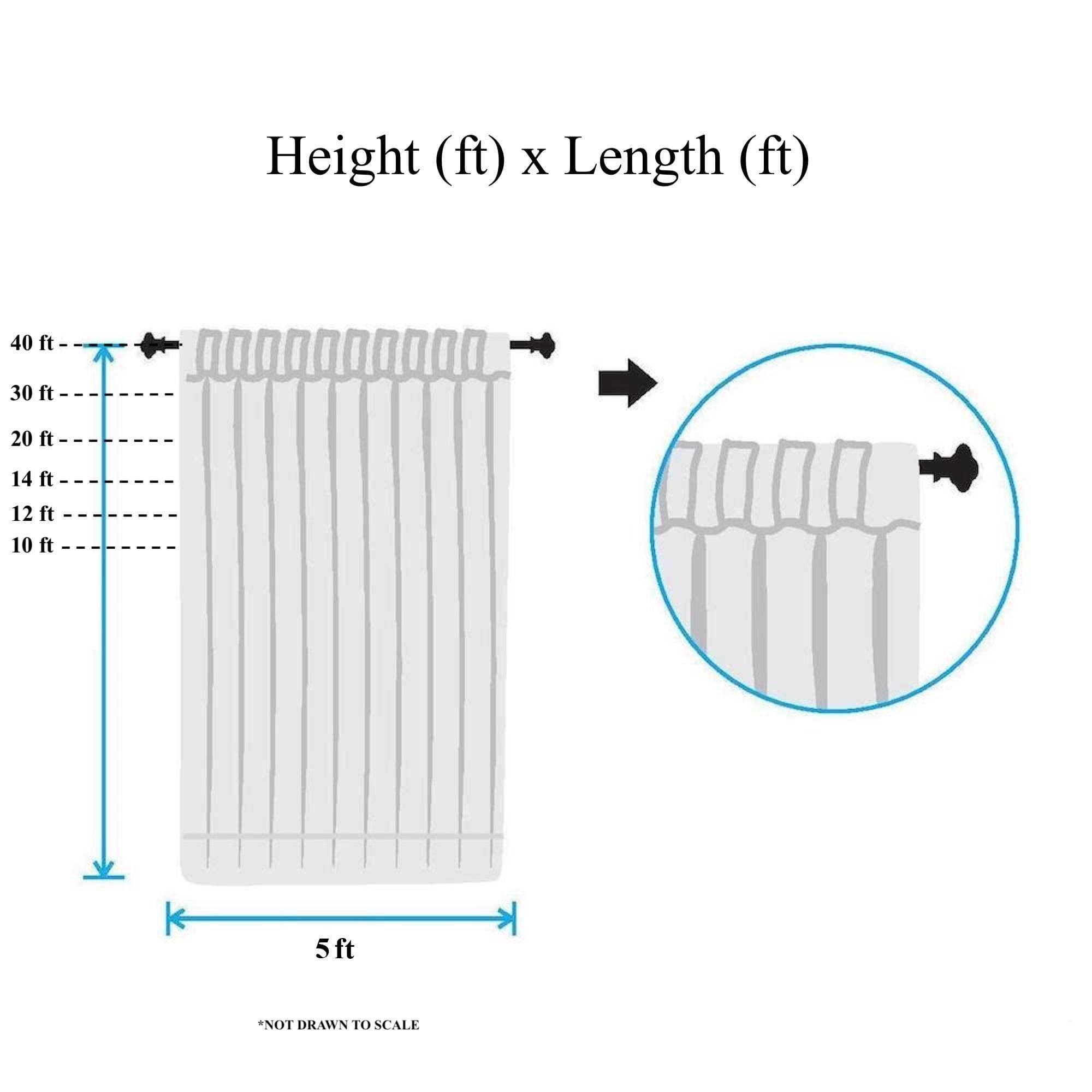Introducing our very own FWD polyester twill rod pocket curtains. Instantly decorate any windows or venues with this simple and stylish curtain panel. These beautiful curtains, made from our polyester twill fabric, have 4” rod pockets sewn on both the top and bottom ends and feature natural finished edges. With this pre-made curtain, you can conveniently setup pipe and drape backdrops using the 4” rod pockets, which slide over your choice of curtain rods (not included). These rod pocket curtains come folded and prepackaged in many different sizes. The width (side to side) of the curtains are all 5 feet and the length (top to bottom) ranges from 10 feet all the way to 40 feet tall - this helps accommodate venue heights of all sizes. For best appearance when using as drapes, we recommend using 2 or more pieces of 5ft wide panels for every 5 feet of pipe to be able to properly swag and drape.