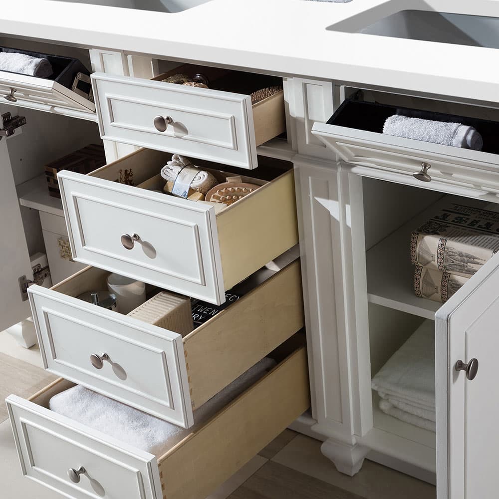 The Bristol 60" Bright White Double Vanity features a full plinth base, also known as a toe kick or pedestal base, this wraparound base allows for quick clean ups. This vanity is complimented by satin nickel door and drawer pulls, along with an optional wood backsplash. The look is completed with a polished Classic White top by Silestone and premium solid surface sink(s). Functional Fashion. The Bristol Collection marries personality with function. This series was designed for maximum storage space and maximum ease of use. Directly behind the square “tulip” legs, we have crafted a full plinth base, also known as a toe kick or pedestal base. This wraparound base allows for quick clean ups, so it is perfect for high traffic use bathrooms. Bristol cabinets are constructed from kiln-dried Poplar & Mahogany hardwood solids and Poplar & American Walnut veneers. Cabinets are offered in four neutral, but far from boring colors: Whitewashed Walnut, Bright White, Saddle Bronw, and Vintage Vanilla. Simple Satin Nickel finish knobs compliment the beautiful finishes, and coordinating wooden backsplashes complete the custom appearance of the cabinets. Two door cabinet with two shelves and six drawers, top outside drawers are tip out style. Cabinets are finished inside and out, with a premium undercoat finish for superior moisture and UV resistance. Drawer bottoms are lined with our signature brushed aluminum laminate. Optional designer wood backsplash included with cabinet. 3cm polished Classic White top by Silestone is highly stain and scratch resistant with low liquid absorption rate. Premium sink(s) specifically made for our 3cm Silestone countertops, these solid surface sinks are rated for both residential and commercial use. Premium soft close hinges on doors, with under-mount soft close slides on drawers. Hand-turned, square, tulip style legs on cabinet, with full plinth base for easy floor cleaning.
