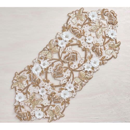 The Papillon runner is a stunning masterpiece adorned with exquisite hand-beaded butterflies and delicate white flowers. Fashioned with precision using glass beads and sequins, the three-dimensional hand-beading techniques bring lifelike textures to the flowers and wings. For a complete look, pair it with coordinating beaded placemats. Transform your table into a blooming garden of elegance with this versatile floral theme. Or simply leave it on the table between meals as d���cor.