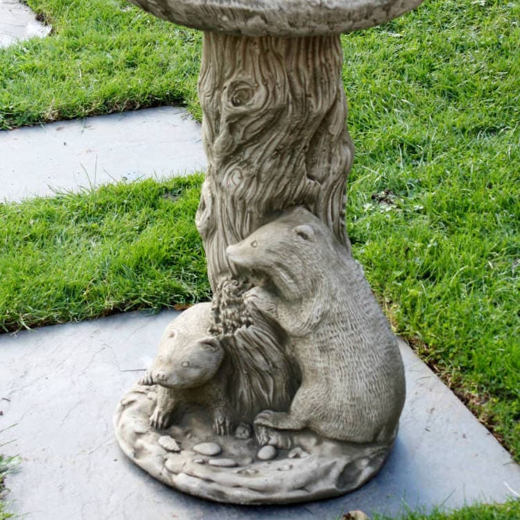 Attract a wide variety of feathered creatures to your garden or backyard with this charming Badger Stone Bird Bath featuring a round base, a sculpted ornate plinth depicting two badgers and a tree trunk, a round water bowl, and an authentic finish. This stone garden ornament is made of solid cast stone and is available in four colours to meet any taste and garden decor. This birdbath stoneware is suitable for residential, public, and commercial places such as hotels, spas, restaurants, villas, and parks. It will attract the attention of all your neighbours and guests, and give you years of pleasure.