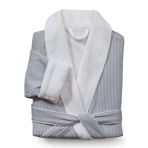 Tie-belt bathrobe combines classic style with comfort. It features a striped seersucker exterior and a plush fleece lining. Pockets are subtly hidden for convenience, and a sewn-in loop makes it simple to hang.