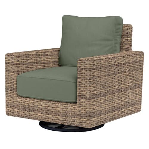 Crafted in the highest quality comfort and durability, the Naevia Swivel Club Rocker captures the relaxed nature of outdoor living with its organic texture and ample proportions. Featuring a premium all-weather wicker and swivel rocker base, Naevia was engineered for endless relaxation and entertaining. It includes a fully welded powder-coated aluminum frame, wrapped in virgin PE Resin Wicker, and utilizes Progressive Springing System Technology. The weather-resistant, high-resiliency foam cushions are stocked in Premium Sunbrella fabric. Non-marking plastic glides and commercial quality construction ensure durability.