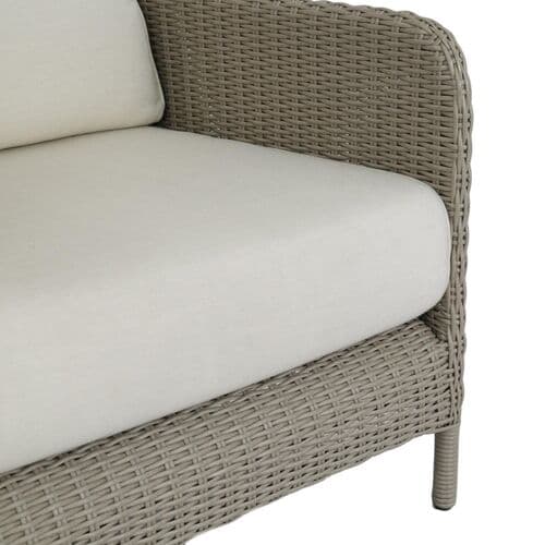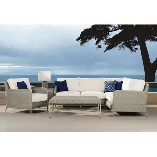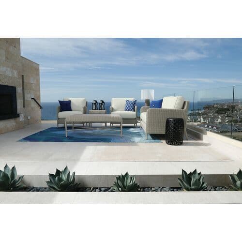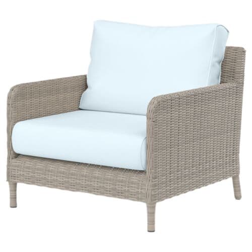 The Maye Club Chair incorporates organic curves and sleek lines for a transitional take on outdoor living. Featuring a mid-rise back, its elegantly curved frame is expertly wrapped in all-weather premium resin wicker. It includes a fully welded powder-coated aluminum frame, Springing System Technology, and weather-resistant, high-resiliency foam cushions. The chair is stocked in Premium Sunbrella fabric and features non-marking plastic glides. With commercial quality construction,