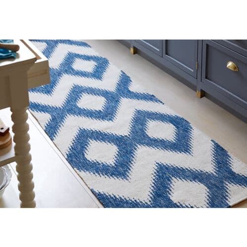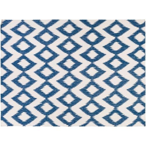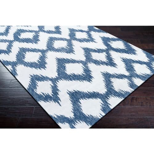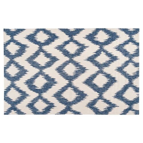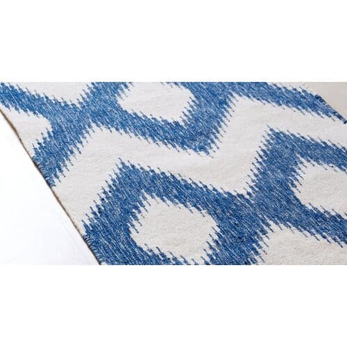 Enhance any room with the visual impact of this handwoven, reversible wool rug featuring an ikat-inspired navy design. To prolong its life and keep it in place, a rug pad is recommended.
