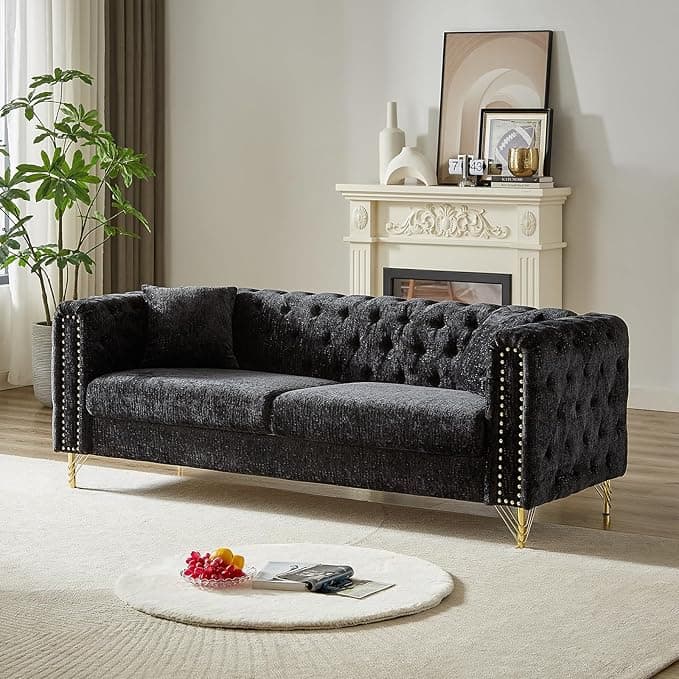 JEEOHEY 80"W Chenille Sofa Couch, 3 Seater Loveseat, Button Tufted Comfy Couch with Nailhead Trim & Metal Legs, Mid Century Modern Sofa, Deep Seat Sofa for Living Room, Office, Apartment (Black)