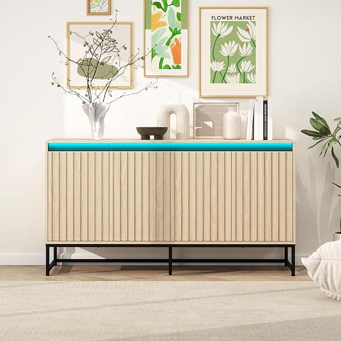 Carved 4-Door Sideboard with LED Lighting & Adjustable Shelves - Modern Buffet Cabinet for Living Room, Dining Room, or Kitchen - Elegant Natural Wood Finish & Black Metal Legs