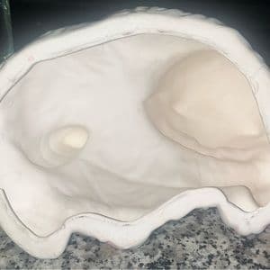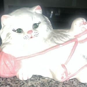 White Studio Glazed Ceramic Hollow inside Green painted eyes and pink ball of yarn Has a minor chip on the yarn that’s barely noticeable Approximately 12 inches wide and 6 inches tall Super Adorable Gift Made in 1983 !