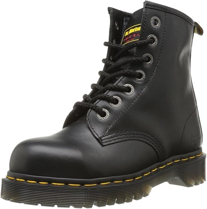 Black smooth leather, 7 eyelet boot with pvc sole, heat resistant to 70 c. Dr.martens airwair with bouncing soles.