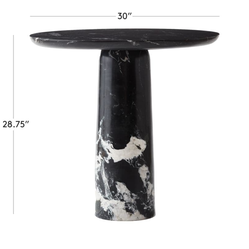 The 30-inch all-marble table is truly an artistic piece. Light grey and white veins gracefully traverse the black marble surface and extend down the rounded solid base, highlighting nature's elegance.