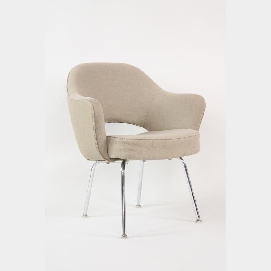 Mid-Century Modern Knoll Saarinen Tan Executive Armchair. Chair has tan upholstery and tubular steel legs. Label from Knoll underside has been removed. Dimensions are 32 in h x 26.5 in w x 23 in d. Seat height is 17 in. Condition is good with minor fading to upholstery. Metal base is clean and all foot pads are present. Please call or email for a detailed condition report.