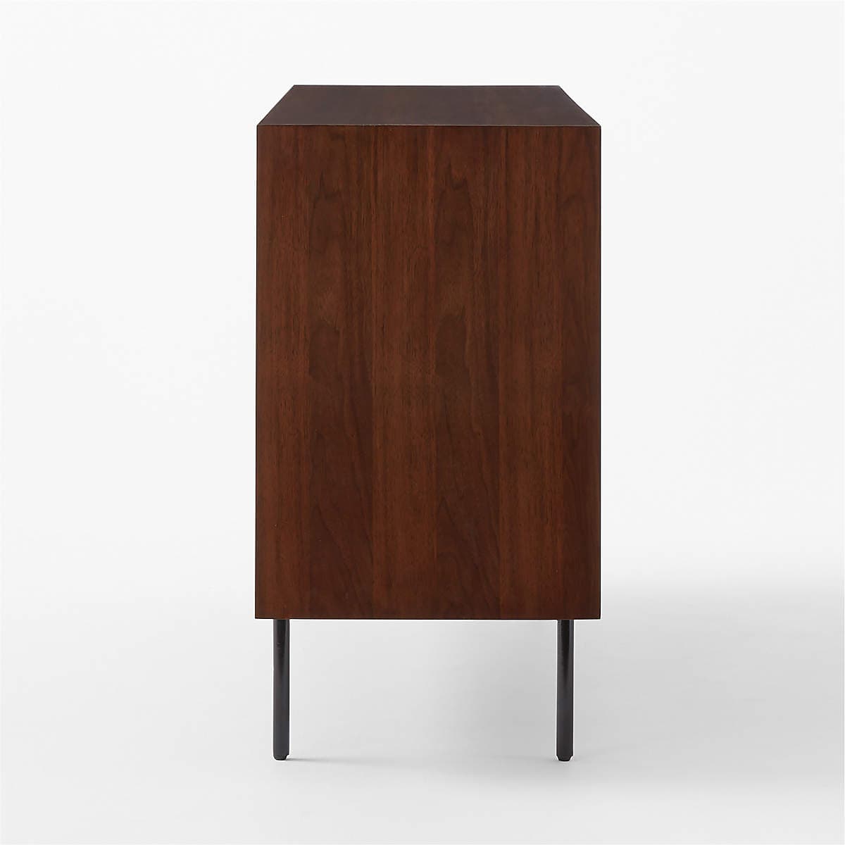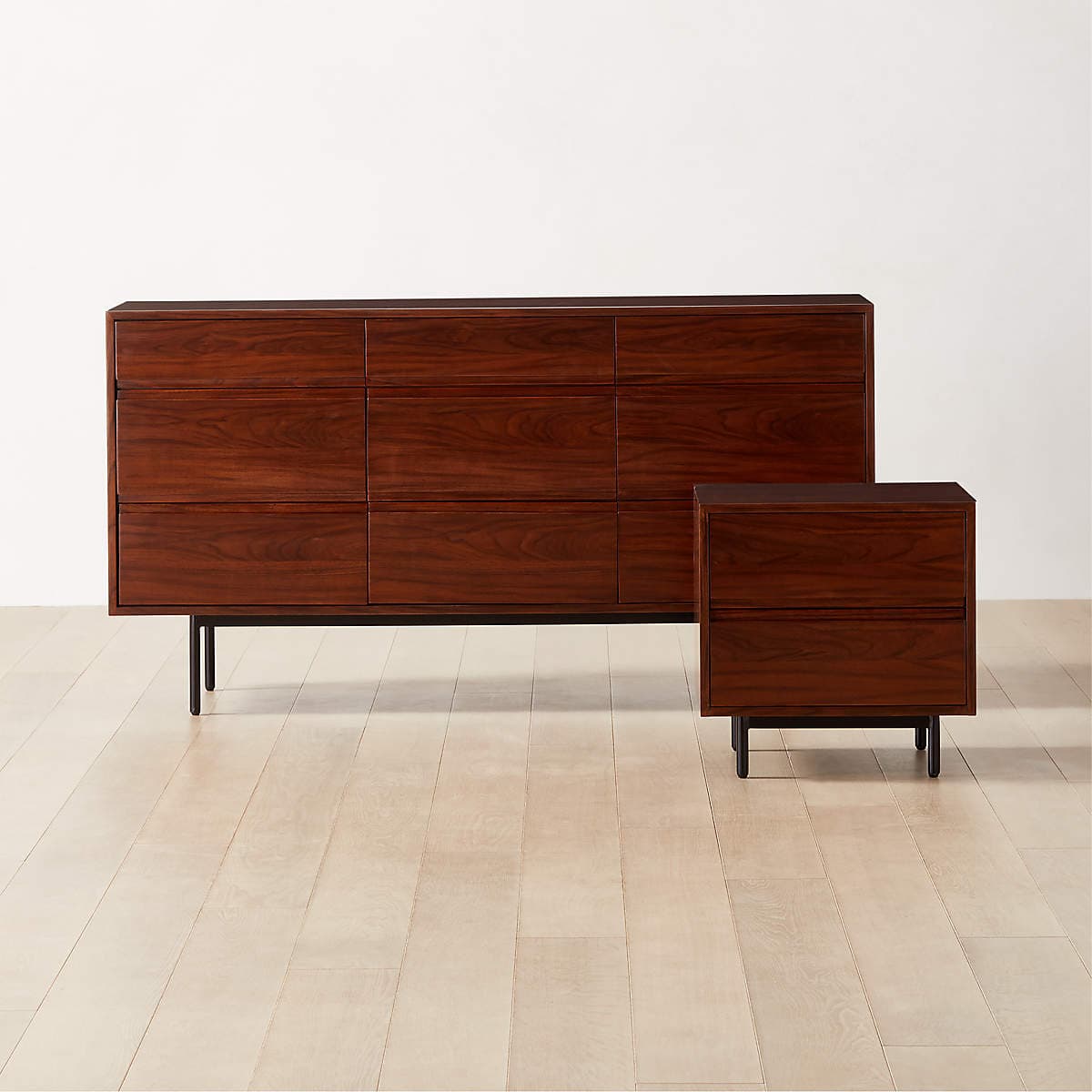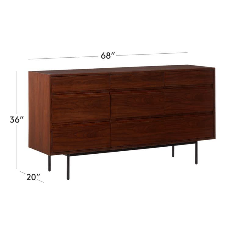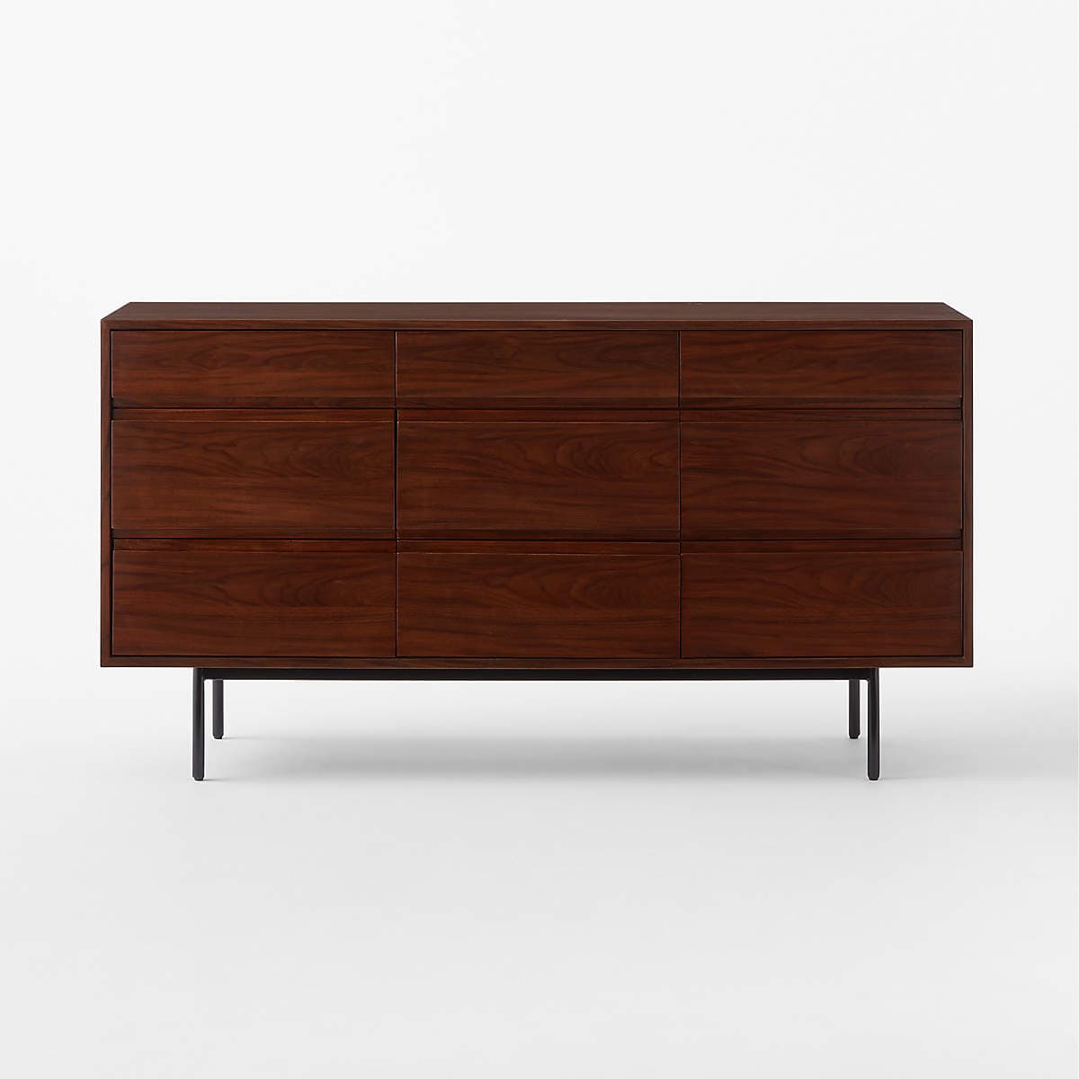Currently on sale. Purchase the Cardiff 9-Drawer Wood Dresser. This nine-drawer dresser showcases Brazilian modernist influences. The clean-lined frame, made from solid mindi wood, features a faux rosewood veneer with a rich grain that contrasts beautifully with its cylindrical metal legs.