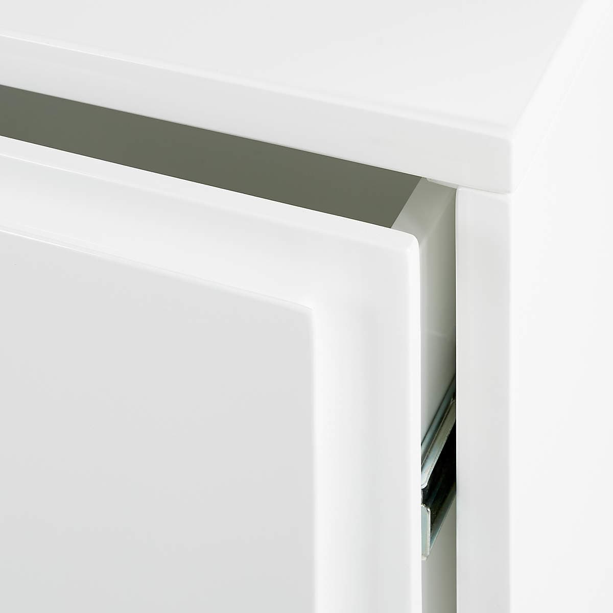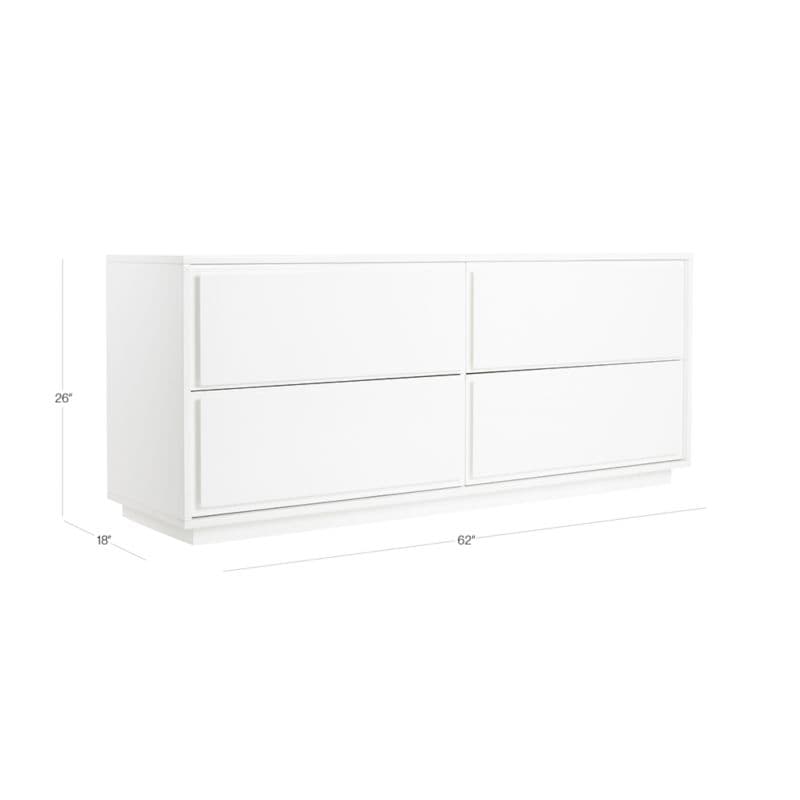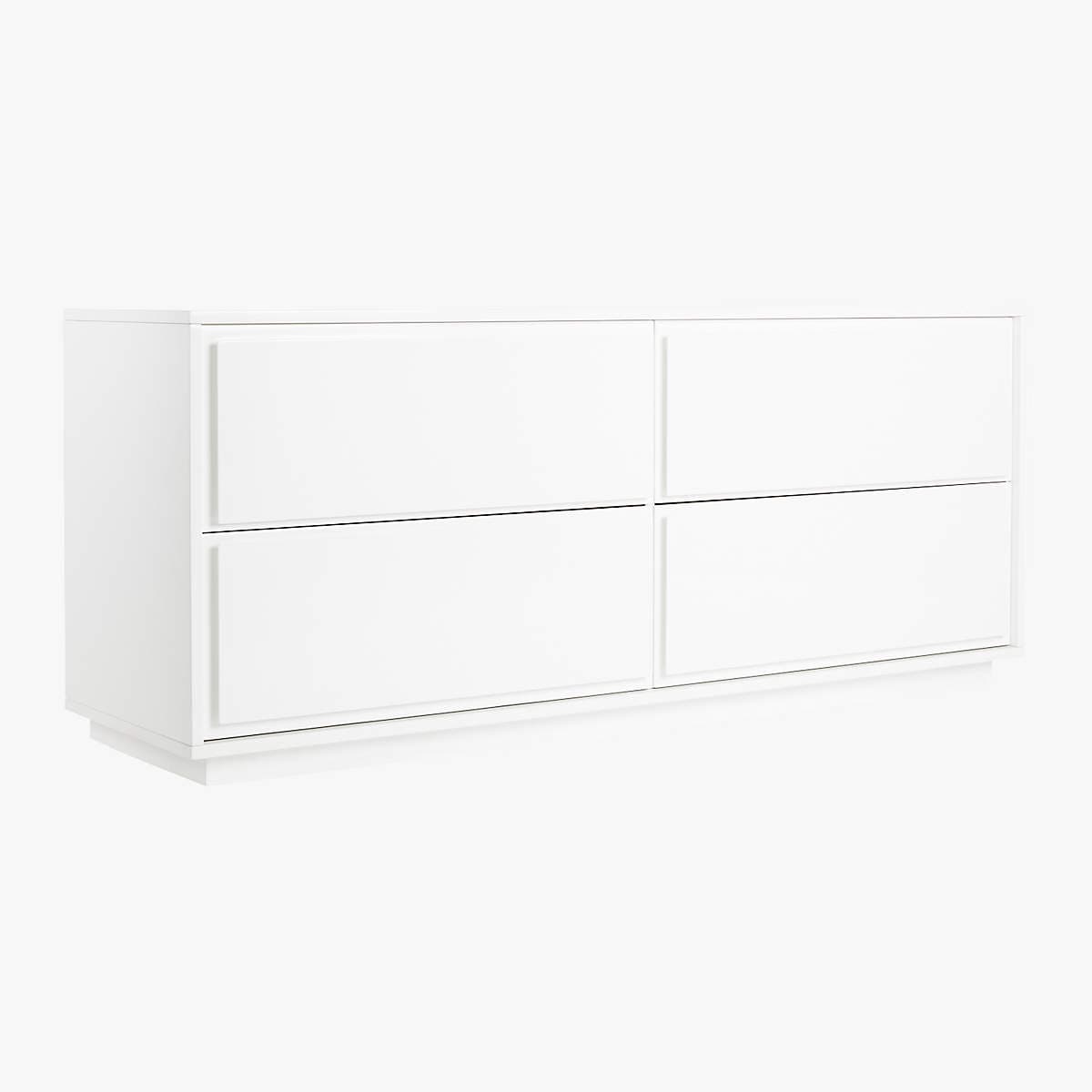 Shop the Gallery Low 4-Drawer White Dresser. This minimalist dresser features a modern design with a glossy white lacquer finish. Four spacious drawers offer a clean look with recessed panels instead of traditional hardware. A slim plinth base provides stability and a sleek appearance. Learn more on our blog. Exclusive to CB2.