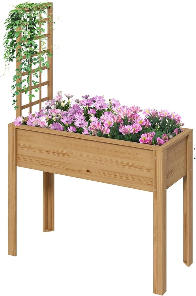 Outsunny Raised Garden Bed with Trellis for Climbing Plants, Elevated Wood Planter with Drainage Holes, Filter and Legs for Vegetable, Flowers, Natural