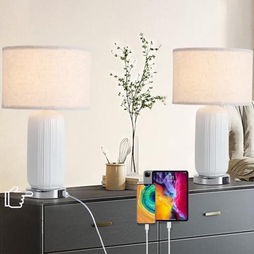 18" White Table lamp with USB,Morden Single Ceramic lamp for Living Room,Good Choice of nightstand Lamp for Bedroom, Morden White Ceramic lamp with 3-Way Dimmable Touch Control