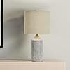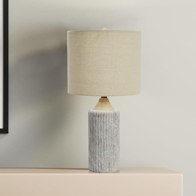 This elegant, vertically embossed stoneware desk lamp features a sleek cylindrical base topped with a linen drum shade. White-washed cement table lamp with natural linen drum shade. Add a subtle touch of style and sophistication to a home office or living space with this artfully crafted table lamp. Maximum 60 watt lightbulb (not included). Lamp measures 23.5" H x 12" L x 12" W; 5' Cord.