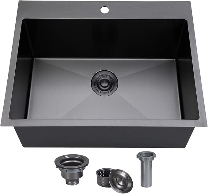 Black Drop In Kitchen Sink Exterior Dimensions: 25'L x 22'W x 8'D; Interior Dimensions: 23'L x 18'W x 8'D; 8 Inch Deep Black Drop In Kitchen Sink. Perfect for RV Camper, Laundry and Utility Sink, Small Kitchen, Outdoor, Bar Sink. Premium Quality: 25 Inch Kitchen Sink is made of SUS304 Stainless Steel Construction with Gunmetal Black(Dark Gray) NANO finish ensure scratch & stain-resistant usage; 16 Gauge(1.2mm) Sink Body ensures long-lasting and durable lifetime use.