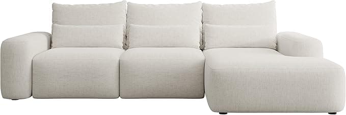 Selsey Corner Sofa Corner Sofa Bed Couch with Storage Space Sleep Function Easy Care with Cushion Lumbar Cushion L Shape Freestanding Right Hydrophobic Chenille Cream Carnos. With spacious storage box for the whole bedding. Simple design harmonises with many furnishings. Textile cover promises pleasant feel and cosy appearance. Thanks to the all-round cover, the corner couch can stand freely in the room. Quickly converts into a comfortable bed - thanks to the smooth-running DL machine.