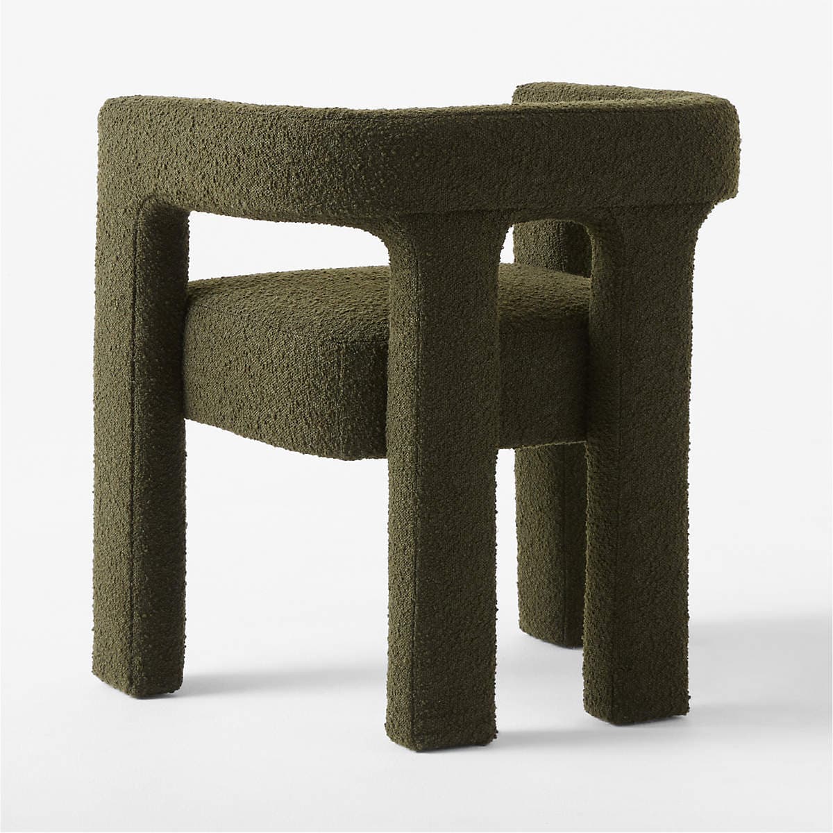 Browse the Green boucle dining armchair, perfect for bringing a lounge feel to your dining area. Its architectural design and plush feel offer a deep seat with a rounded cutout back for additional comfort. Available exclusively at CB2.