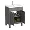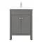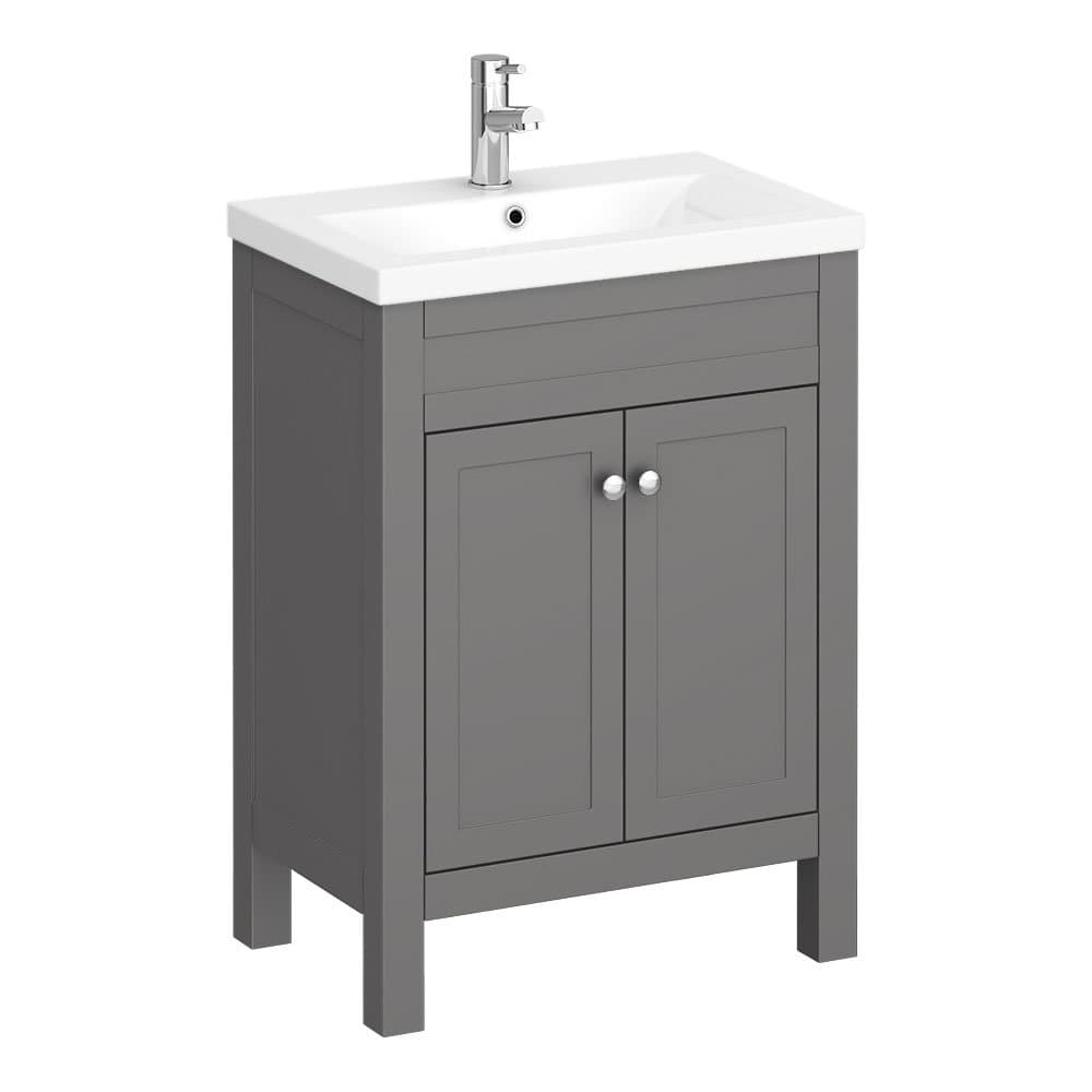 Banish bathroom clutter with this shaker-style Trafalgar sink unit. Inside the generous vanity cabinet, you'll find a handy shelf that's perfect for keeping all of your toiletries in order. Its clever soft close doors even prevent unwanted noise when closing. This chic grey bathroom furniture piece is manufactured from durable wood and comes supplied with a high quality mid-edged ceramic basin. It's floor standing, and measures 610mm in width.