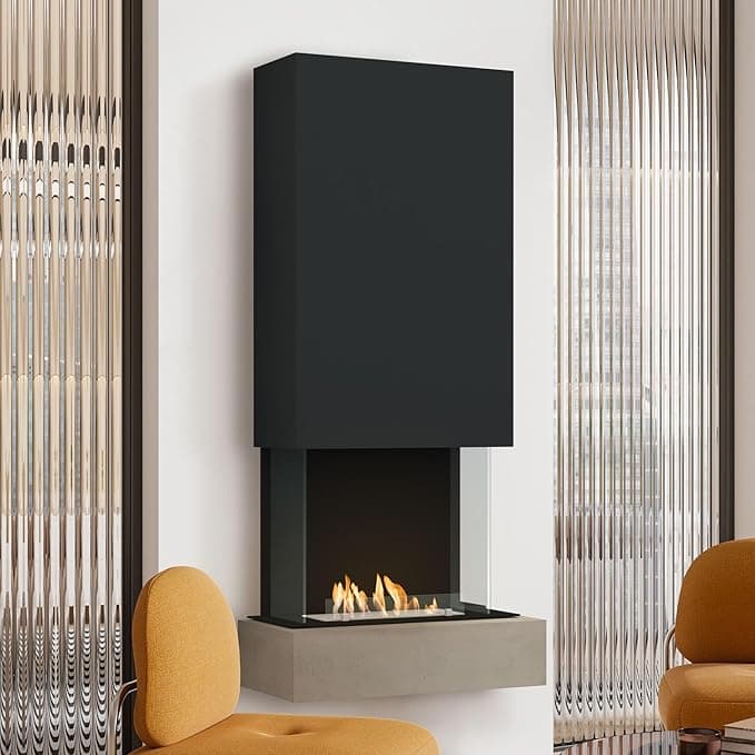 The Sona ethanol fireplace from muenkel design at a glance: Information on combustion. - Fuel: bioethanol. - See table below for details on: - Heat dissipation. - Capacity: - Burning time - Ethanol consumption. - Continuously adjustable. - Recommended fuel: Gala ethanol 96.6%. - Information about the minimum room size for ethanol fireplaces. - Safety features: - Ignition without deflagration. - Anti-slip over (spill protection). - Micro-pore system (highly effective combustion). - Mechanical glow sensor indicates the activity of the fireplace. - Manufactured according to ethanol fireplace TÜV standard DIN 16647 (not tested). - Features: - Modular design: - Easy to assemble in 30 minutes. - Only 2 people required. - No gluing, walls or cleaning. - Materials: - Fire bench with real stone surface. Various designs available: - Nero (natural slate on MDF black). - Galaxy (natural slate on MDF dark grey). - Concrete concrete look. - Smoke hood (aluminium) powdered in different colours: - Black grey (RAL 7021). - Pure white (RAL 9010). - Dimensions (W x H x D): 80 x 179 x 40 cm. Weight: approx. 49 kg. - Usage: Indoor - Also available as an Opti-myst electric fireplace. - Made in Germany. - Box contents: - Fireplace including muenkel design safety burner. - Decorative wood is not included.