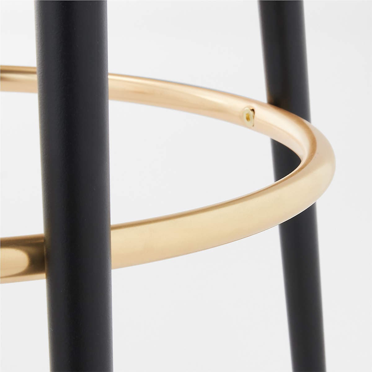 Currently available at a reduced price. Caleb Zipper enhances the traditional bar stool design with premium finishes. The iron frame boasts a matte black texture and includes a round brass-plated footrest. The seat is covered in black velvet, providing a comfortable place to sit.