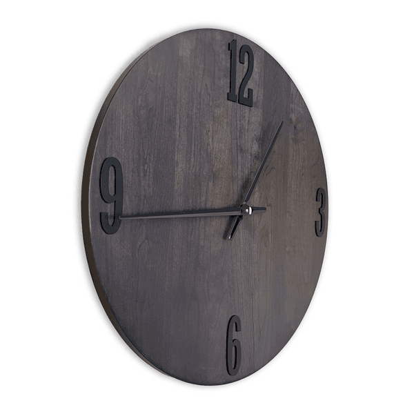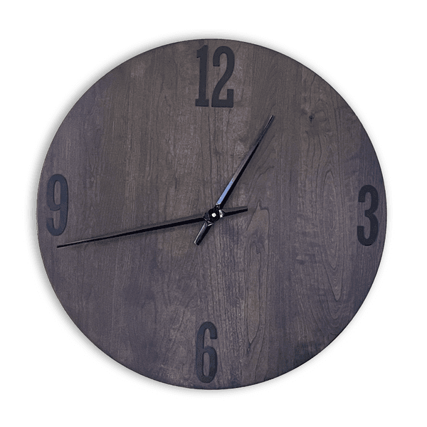 Pictured: Cherry Java and Cherry Cobblestone. Designed, manufactured and hand-finished in our small studio in Michigan. The clock is made of cherry wood. The stain you’ve chosen is applied to your clock, we then apply a seal coat and top coat to add durability and to protect the finish. Diameter: 23 in' or 58.4 cm. Will require one double A battery. Batteries not included. Up to 7 lbs. Each cherry clock is unique as each piece of wood is unique with different grain, fiber arrangement and shade of the wood. Because of this, your clock will look similar, but not match the example pictures we’ve provided. The true color of our product could vary from what you see on your electronic device due to display settings. In our studio we follow these production steps to get you your perfect and one of a kind clock! First we take lumber and cut them into linear staves (strips) of wood to the height of your clock. Then we glue these staves together, creating a slab that is the diameter (both height and width) of your clock. We then take this slab and really begin creating your clock on a CNC machine in a two-step process. First, we will process all of the back milling, with the back face up. Second, we will process all of the front milling, with the front face up. After this, we sand the clock to prepare it to be finished (stained or painted). The clock then runs through our Finish department, assembled plus a final quality inspection prior to being shipped to you. Due to the nature of “Made to Order”, please understand your item will leave our facility within 10 business days of your order (excluding holidays and planned production shutdowns).