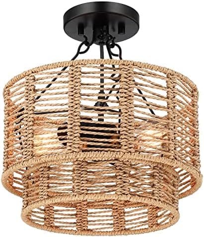 Hermasgi 12.6'' Farmhouse Rattan Semi Flush Mount Ceiling Light, Boho Light Fixture with 2-Tier Drum Hand-Woven Natural Rattan Shade, Perfect for Hallway, Bedroom, Entryway, Living Room