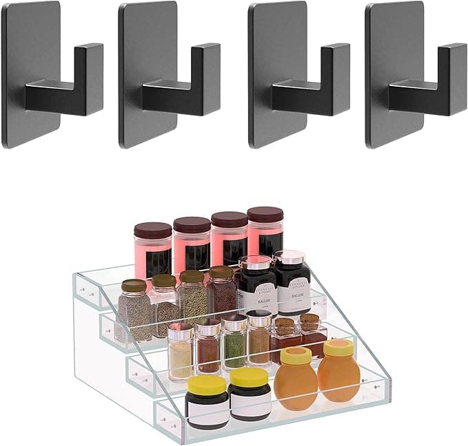 PMMASTO Black Adhesive Hooks & Clear 4 -Tiered Acrylic Spice Rack Organizer,Spice Shelf Organization, Seasoning Organizer, Clear Acrylic Vertical Shelves ,Robe Towel Wall Hooks for Wall, Kitchen, Bat