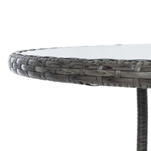 This set includes four chairs and a round glass-topped table, perfect for stylish alfresco dining. The chairs have comfortably filled seat cushions, and a shelf under the table is useful for storing condiments and serving items.