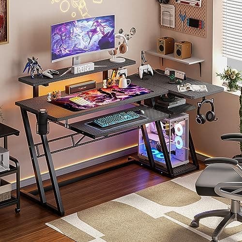Gaming Desk with Power Outlets and LED Lights, L Shaped Gaming Desk with Shelves, Reversible L Shaped Computer Desk for Gamer, Carbon Fiber Black, 47"