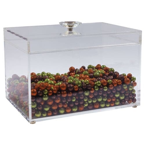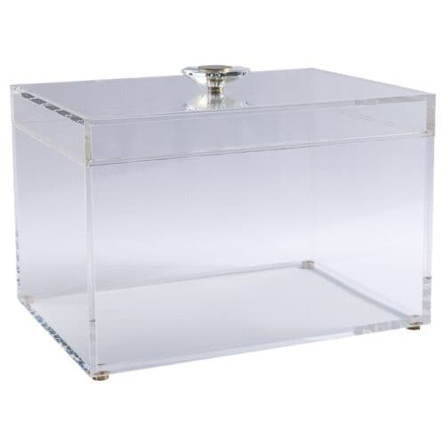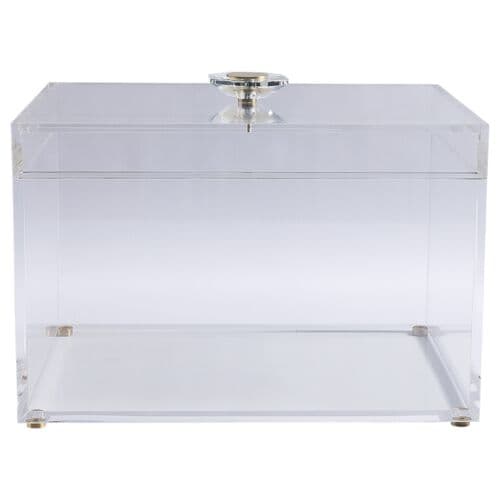 We love the translucent quality of these boxes, allowing light to pass through and give them a 'glow'. With a lift-off lid and statement hardware finial, these boxes provide a dramatic punch that designers love to add to a room. A touch of animal print or texture is always a classic. You can store remotes or simply stack magazines inside for a designer-organized look in the den. This season, we have added options in trays, artwork, lighting, boxes, and an end table. We hope you will discover all the options when you want that finishing touch to the room. Measurements: 10"H x 14"W x 10"D. Materials: acrylic, metal brass feet.