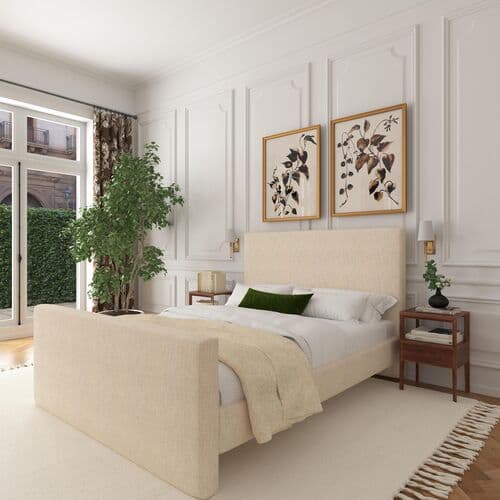 The Lenora platform bed showcases understated elegance with its fully upholstered frame and headboard, offering a clean aesthetic customizable with various fabric options. Its open base promotes a cozy yet airy vibe, while the padded headboard provides comfort for reading or watching TV. Made in the USA, this stylish bed eliminates the need for a box spring with its slat system, blending style with practicality.
