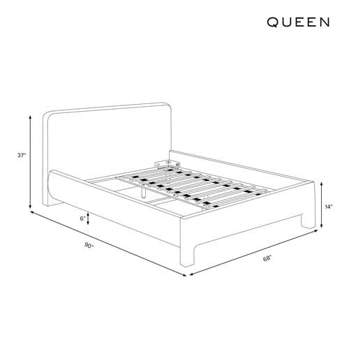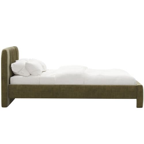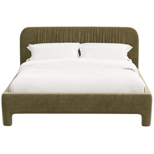 Transform your bedroom with the Juniper platform bed, upholstered in rich velvet. Its softly curved structure provides a cozy yet open feel, and the padded headboard ensures lasting comfort. The integrated slat system negates the need for a box spring, combining elegance with functionality, crafted in the USA.