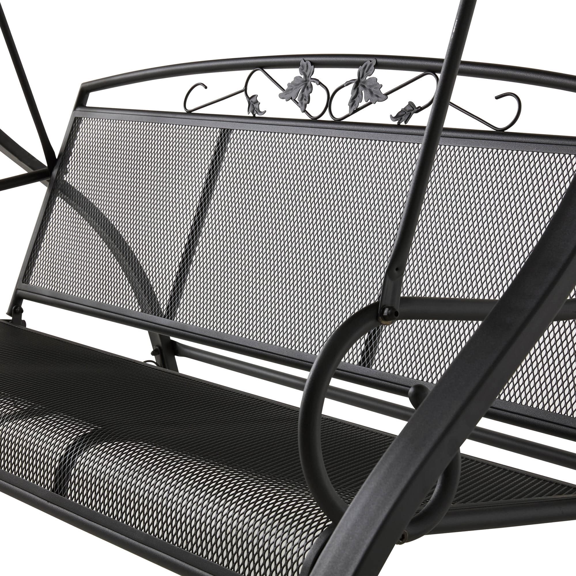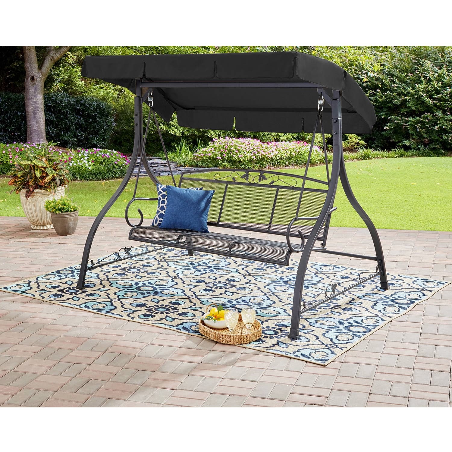 The Mainstays Jefferson 3-Person Swing is a fun and relaxing addition to your backyard. It pairs stylishly with any dining, chat, bar or bistro sets. The Mainstays swing and frame are constructed using powder-coated steel to resist rusting. It is tested to hold up to 750 pounds and is a matte carbon finish. The durable swing also features a matching adjustable, scalloped edge canopy made of UV-rated outdoor fabric. This tranquil furniture piece is extraordinarily serene, cool and an ideal place to relax. Enjoy it by yourself for some quiet time or share it with loved ones while chatting the afternoon away. It is easy to assemble. The black frame and material are designed to match most outdoor color themes. You can place a rug under your Mainstays Jefferson 3-Person Swing and even add some pillows and cushions to help create your own outdoor oasis at home.