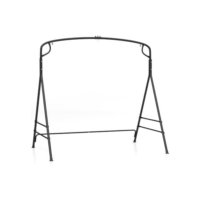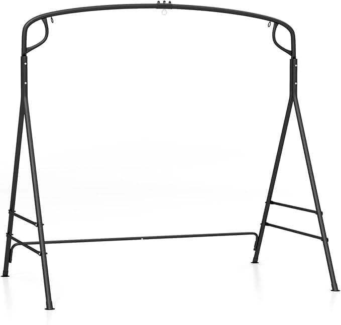 This metal swing frame will create a perfect place to hang your swing. Crafted with robust and rustproof metal frame, the swing stand frame offers unparalleled durability and prolonged service life. Its sturdy A-frame structure, reinforced with double bars, 2 ring design and secure screw connection ensures exceptional stability. With the ability to accommodate various swings such as porch swings, tree swing seats, and hanging egg chairs, this versatile swing frame is a perfect addition to any outdoor space. The well-crafted details, including stable hanging rings and anti-slip footpads, ensure comfortable and safe swinging experiences while protecting the ground from unsightly scratches. Enhance your outdoor relaxation with this premium swing stand that seamlessly blends functionality, durability, and style.